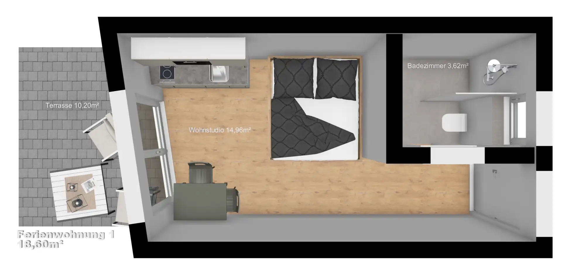 Genießen Sie Ihren Aufenthalt in unserem gemütlichen Apartment mit 19 m² Wohnfläche und einer 11 m² großen Terrasse, auf der Sie entspannte Stunden an der frischen Bergluft verbringen können.