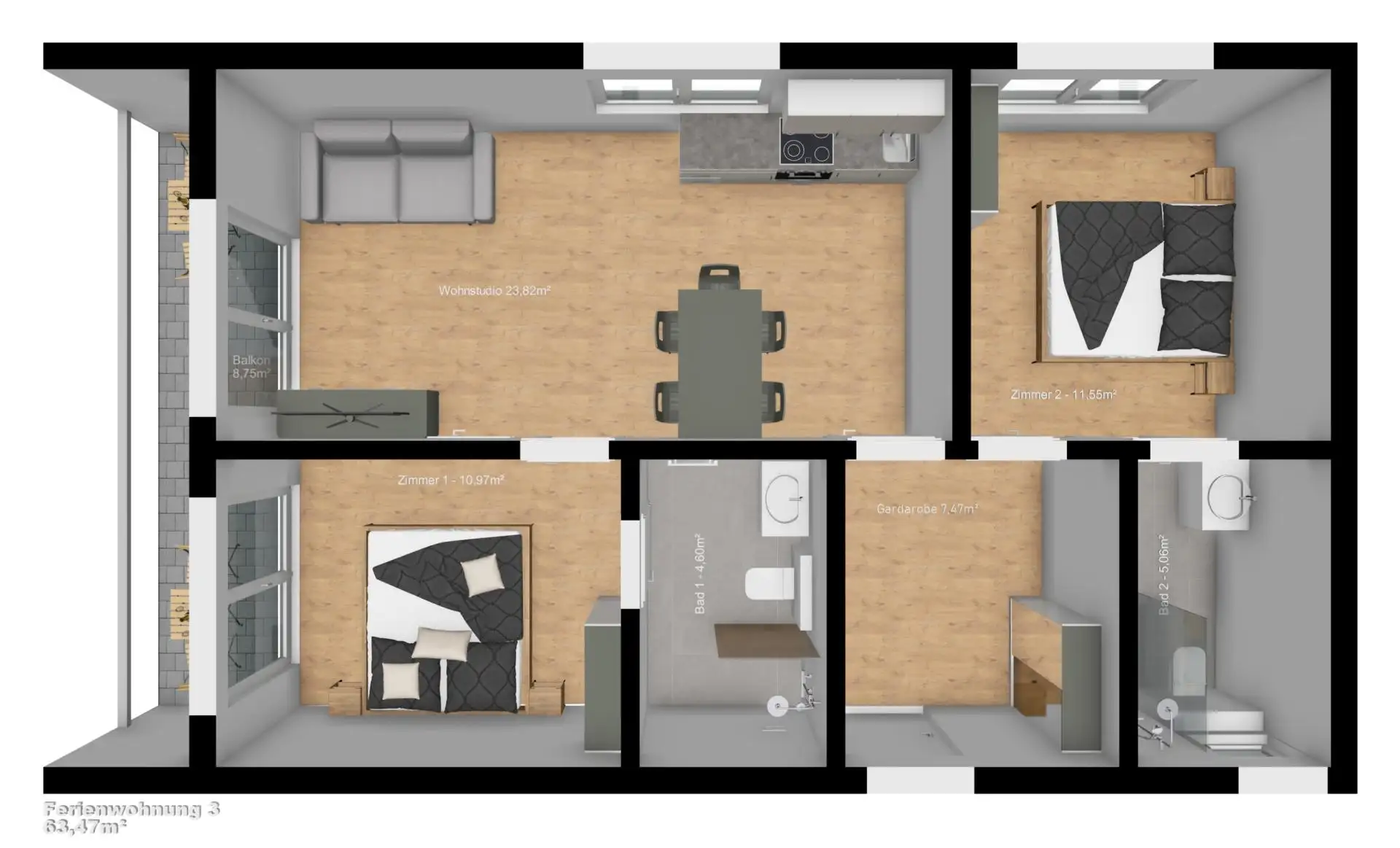 Zwei separate Schlafzimmer mit Doppelbett bieten erholsamen Schlafkomfort. Jedes verfügt über ein eigenes Badezimmer mit Dusche, WC und Föhn. TV-Geräte befinden sich sowohl in den Schlafzimmern als auch im Wohn- und Essbereich.
